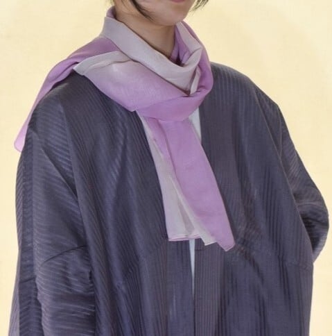 “Fujigasumi” shifts from pale grayish wisteria to wisteria violet—an ombré gradation with sheer elegance, suited to both Western and Japanese styling —as a stole, a light wrap, or an accent piece.